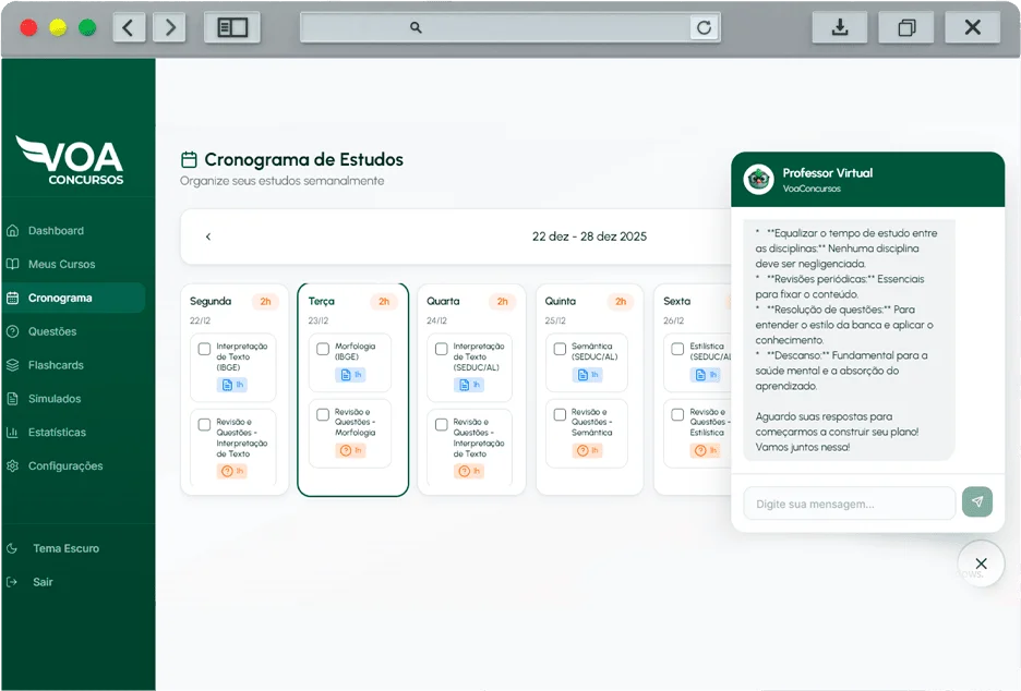 Sim! A IA analisa constantemente seu desempenho nas questões e ajusta o plano de estudos para focar nas suas dificuldades e otimizar seu tempo.