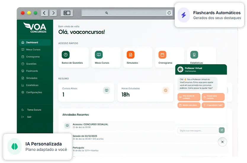 Apostilas inteligentes + destaques + flashcards automáticos + questões + simulados + plano estratégico com IA.